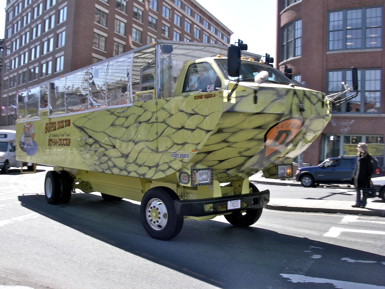Everyone knows about the Boston Duck Tours, but there’s a new outfit in set to start tours from Charlestown soon: Super Duck Tours. I saw this one this morning at the intersection of Causeway and North Washington Streets, headed over the Charlestown Bridge.